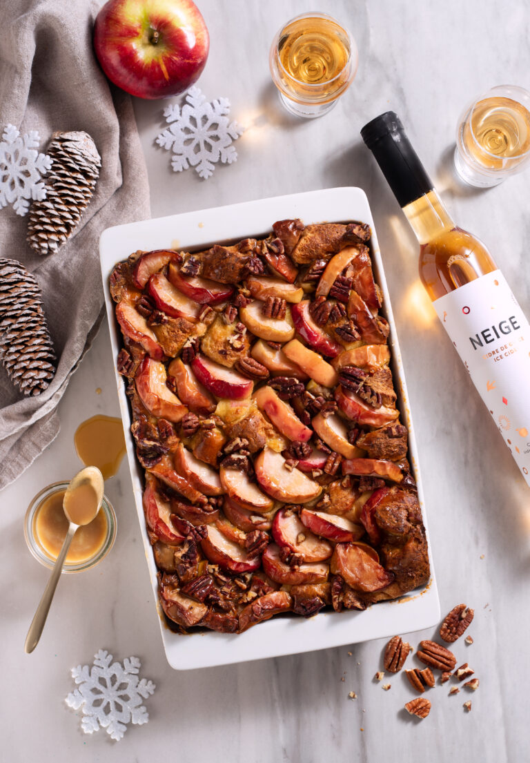 Couper la casserole en carrés et servir avec la sauce butterscotch au cidre, avec le cidre de glace Neige en accord.