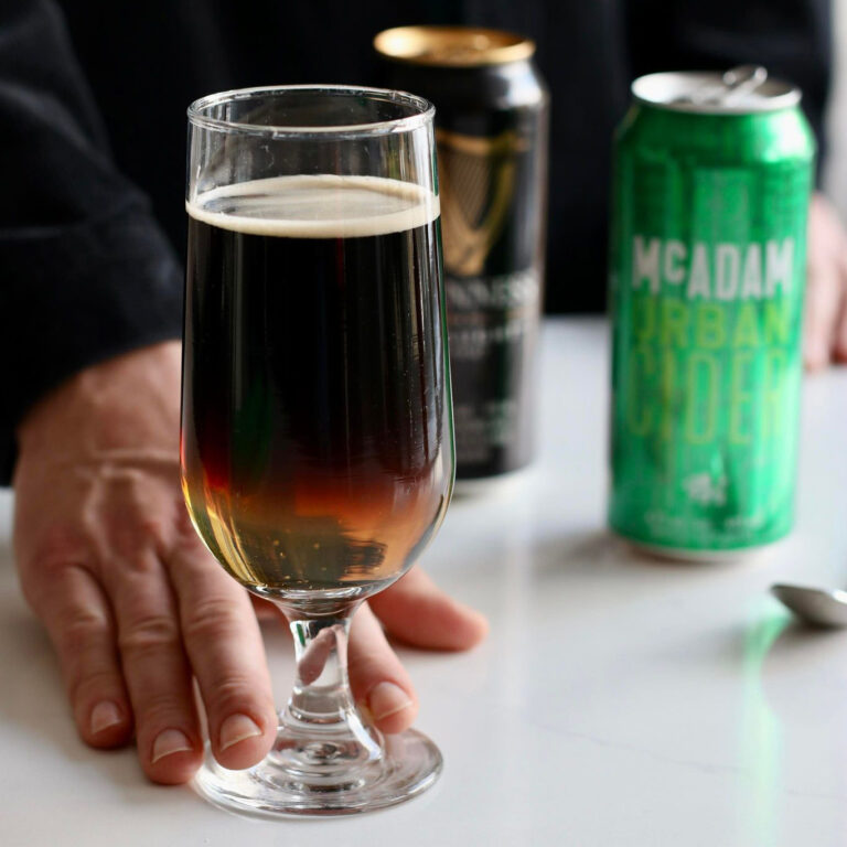 Dans un verre, verser le cidre effervescent et verser ensuite la bière noire délicatement sur les parois du verre ou à l’aide d’une cuillère pour créer un cocktail étagé.