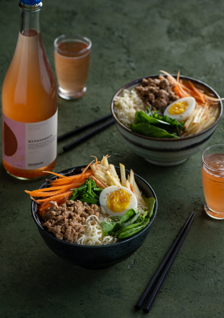 • Dans une autre casserole, préparer les nouilles ramen en suivant les instructions sur l’emballage. Diviser les nouilles égouttées dans deux grands bols de service.