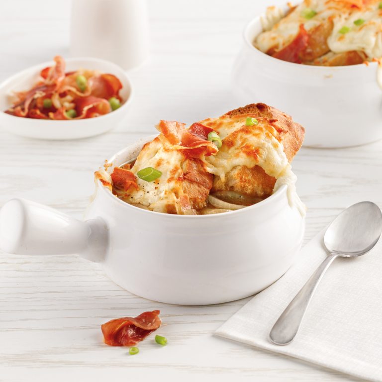 - Garnir chaque portion d’oignons verts et de prosciutto.
