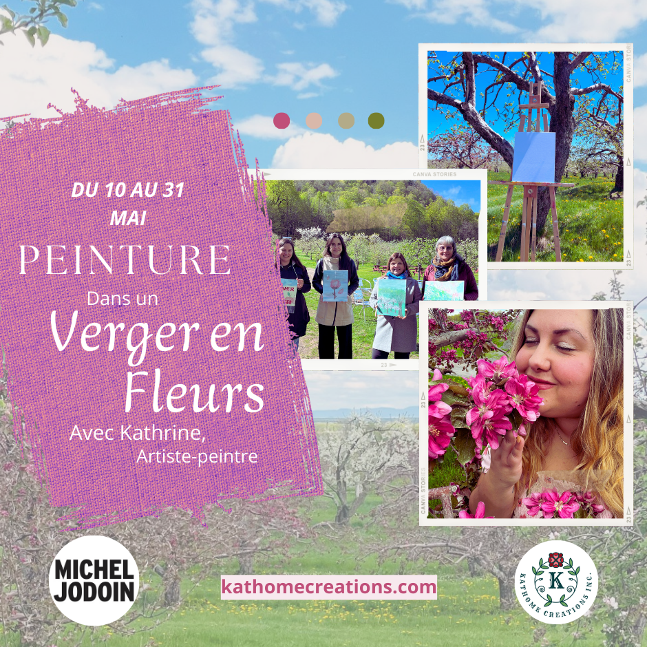 Venez vivre un moment enchanteur au cœur des magnifiques vergers en fleurs! Sous l’œil bienveillant de Kathrine, Artiste-peintre, laissez-vous emporter par la beauté de la nature et créez votre propre chef-d’œuvre!